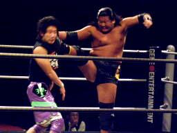 大鷲首投げからサッカーボールキック(右写真)、カウント2。