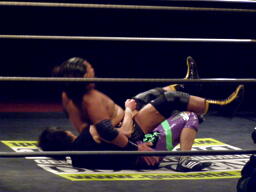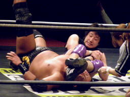大鷲チョークスラム、安部飛びつき十字固めに切り返す(左写真)。