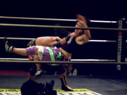 大鷲ブレーンバスター、安部着地してバック取る、大鷲ブレークしてロープに飛ぶ、安部背後に回ってバックドロップ(右写真)。さらにボディスラム、カウント2。