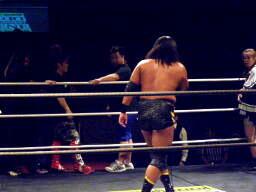 安部「DISASTER-BOX入りは一筋縄では行かないようだな。とてつもない先輩を持ったようだぜ。後楽園、第4期DISASTER-BOX新メンバー査定試合を行う!そしてそのリングに最後に立ってるのはこの俺だ!」(右写真)