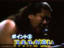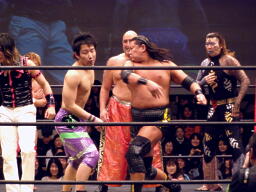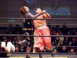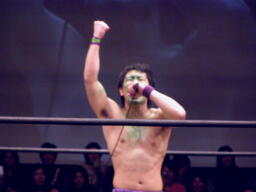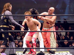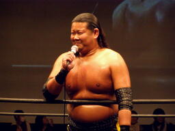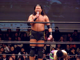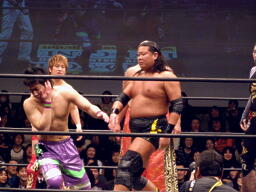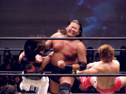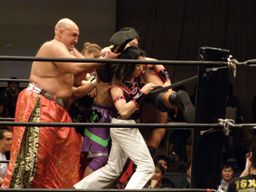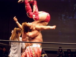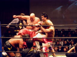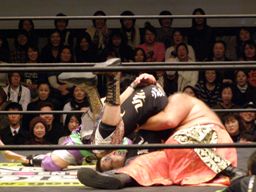 大鷲安部にパワーボム、安部ブロックして首固め(右写真)、全員で押さえ込んで3カウント。
