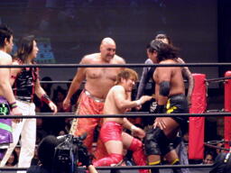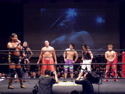 「せっかくの機会なので1人ずつ紹介しようと思います。」と大鷲が言うと5人で一斉に大鷲に攻撃開始(左写真)、ゴング鳴らされる。