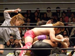 安部ロープに飛ぶ、大鷲ビッグブーツ。美月と田村ダブルで大鷲をロープに振る、大鷲は2人にショルダーブロック(右写真)。
