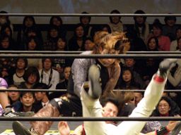 星誕期が田村をコーナーに振る、田村コーナーに飛び乗って反転トペ・コン・ヒーロ(左写真)。星誕期場外エスケープ。