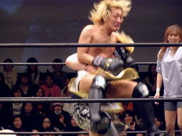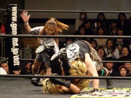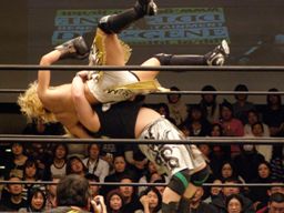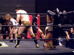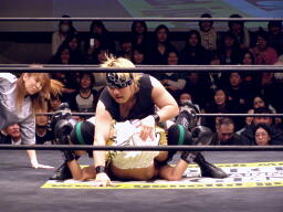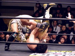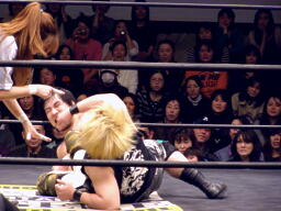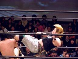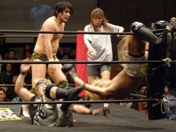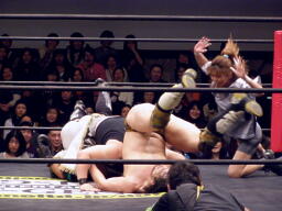 鳥羽を後方回転エビ固め(右写真)、カウント2。佐藤に首固め、カウント2。