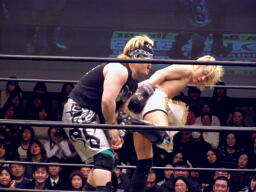 佐藤2人まとめて裏アキレス腱固め(左写真)、2人ともロープに飛びつく。佐藤は鳥羽をコーナーに固定して足にドロップキック。