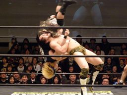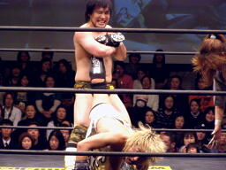 佐藤ウラノを胴タックルで持ち上げて水車落とし(右写真)、カウント2。