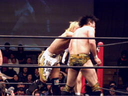 ウラノは鳥羽がまだ逆さ吊りになってるコーナーからミサイルキック(左写真)、カウント2。ウラノ佐藤をコーナーに振る、佐藤鳥羽にぶつかり鳥羽ようやく解放。