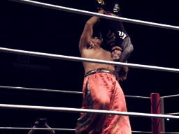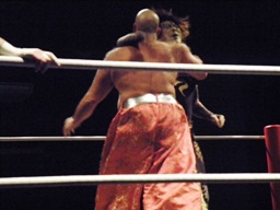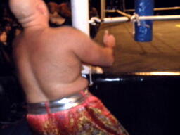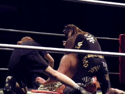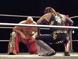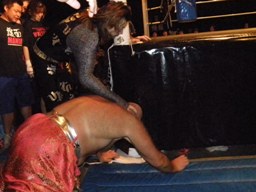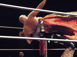 ダウンした星誕期を引き起こす(右写真)。チョップの打ち合い、ポイズンは呪文をかけようとするが星誕期はその手目掛けてチョップ。星誕期ベアハッグから場外で浴びせ倒し、カウント2。