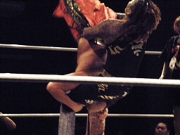 ポイズン先に立ち上がってネックロック、星誕期はブレーンバスターに切り返す(右写真)。ポイズン場外エスケープ。