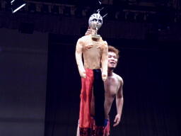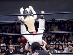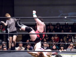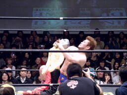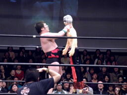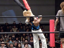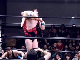 アントンはヨシヒコを肩に担いでオクラホマ・スタンピード狙う(右写真)、ヨシヒコはターンバックルを蹴ってDDTに切り返す。ディーノのサポートでコーナーに上ると高速ムーンサルトプレス、カウント2。