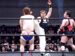 PIZAエルボー、ディーノ股間タッチの応酬。ディーノ男色クロー、PIZAも返し、互いの股間にクローを掛け合う形に(左写真)。しかしディーノが勝ってPIZAを投げ飛ばす。ディーノフライングメイヤー、PIZAヘッドシザーズで返す。両軍タッチ。