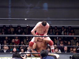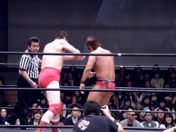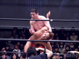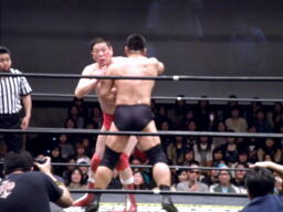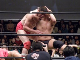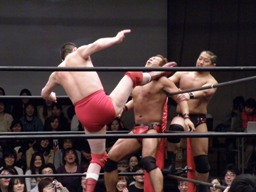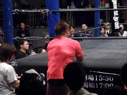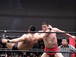 高木ヘッドロック、田上ロープに振ってショルダーブロックの打ち合い(右写真)。高木はラリアットをかわしてドロップキック、マイケルにタッチ。