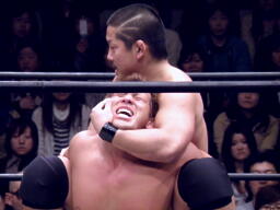 ロックアップからバックの取り合い、マイケル平柳の腕をひねる(右写真)。