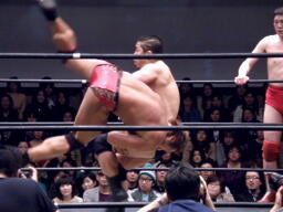 ブレーンバスターは平柳着地、ロープに飛ぶ、高木カウンターのガットショット。高木スタナー狙う、平柳耳に噛み付いてブロック(右写真)、高木をバックドロップで投げると田上にタッチ。