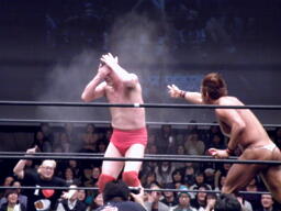 マイケルエルボー、田上脳天唐竹割りの打ち合い(右写真)、マイケルは「熱くなってきたぞー」「火照ってきたぞー」と一枚ずつ脱いで行く。