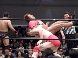 田上顔面ひねり(右写真)、マイケルロープ。5分経過。田上は平柳にタッチ。
