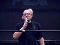 休憩明け、フレンチカレーミツボシ猪熊店長からお知らせ(左写真)。3時からの休憩はなくなり11時から夜11時半までぶっ通し営業、メニューも終日変わらない(昼にハンバーグカレーを頼むことも可能。時間はかかるけど)ように。さらにデザートも導入。新藤リングアナからはケニー・オメガの5/4後楽園ホール大会から5/10博多スターレーン大会の参戦が発表された。KO-Dタッグは後楽園(6日発表)。