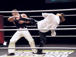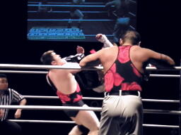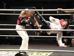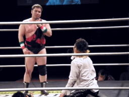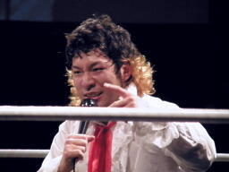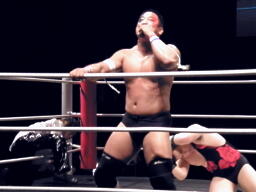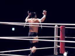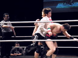 トーゴーロープに飛ぶ、ルイ様トラースキック(右写真)。ルイ様ルイタニック狙うがトーゴーはブロック。ルイ様ロープに飛ぶ、トーゴーラリアット。