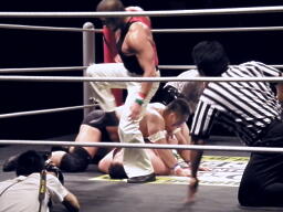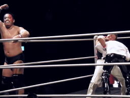 しかしフレンチスプラッシュはルイ様の背中に誤爆(右写真)。ウォリアーは場外に出て暴れる。