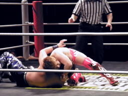 HARASHIMAバック取る、安部切り返してスクールボーイ(右写真)、カウント2。