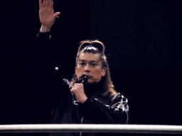両手を上げて「ヤー!」と叫ぶHARASHIMA(左写真)。