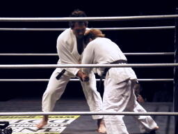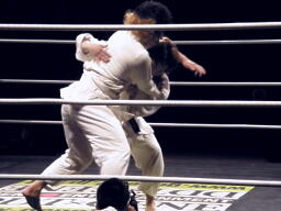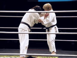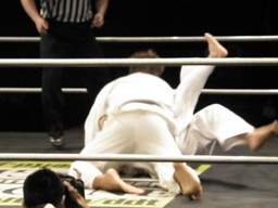 ウラノ奥襟を取って攻める(右写真)。しかし結局規定の3分で決着付かず、松井審判の判断でHARASHIMAの優勢勝ちに。