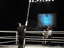 メンバーはしゅくとくがMIKAMI、飯伏、松永、PLが鳥羽、KUDO、ディーノ。10点先取、1セットマッチ。先攻MIKAMIのサーブは大きくトップロープを越えて客席に。当然アウト。一方の鳥羽はうまくサーブを相手コートに入れる(右写真)。