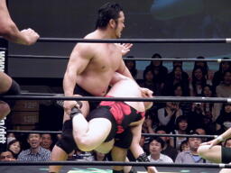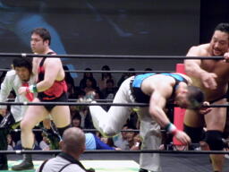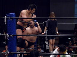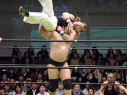 大森がアントンのバックを取る、関本が大森のバック取って2人をジャーマン(左写真)。10分経過。
