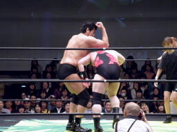 ルイ様首投げからドロップキック(左写真)、カウント2。アントンパンチで反撃するがルイ様ネックロックに捕らえて関本にタッチ。