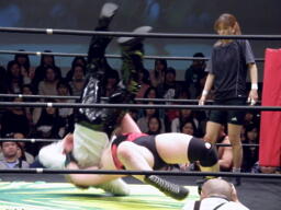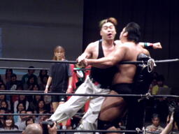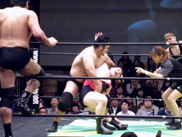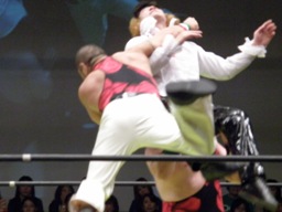 大森スイングネックブリーカードロップ(右写真)、フルネルソンバスター、PIZAがカット。PIZAと関本にタッチ。