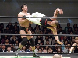 トーゴードロップキック(左写真)、ロープに飛ぶ、大森ビッグブーツ。