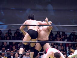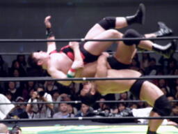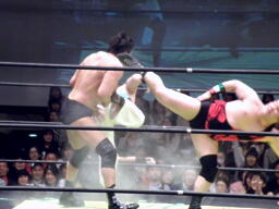 関本がアントンを羽交い絞め、しかしアントンかわして大森のアックスボンバーは関本に誤爆(右写真)
