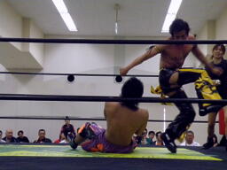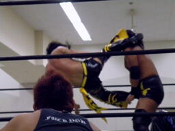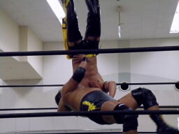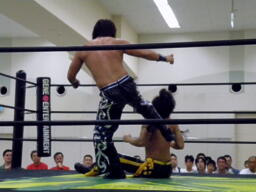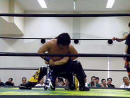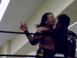 HARASHIMAストンピング、逆片エビ(右写真)、KUDOロープ。HARASHIMAギロチンドロップ、安部にタッチ。安部ロープに振ってドロップキック、カウント2。安部スリーパー、コーナーに下がって大鷲にタッチ。10分経過。