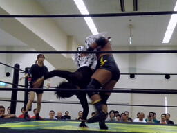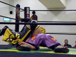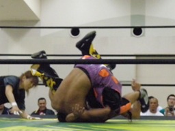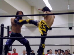 大鷲足を取る、MIKAMI延髄蹴り、大鷲かわす、MIKAMIバックキック(左写真)。MIKAMI「上げるぞ!」と叫んでボディスラムに行くがつぶされる。