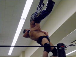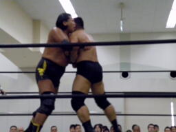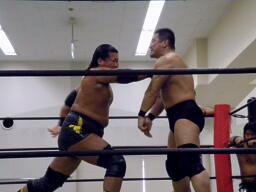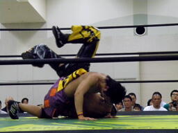 先発はそのHARASHIMAとKUDO。ロックアップ、HARASHIMAロープに押し込む、ブレーク。再度ロックアップ、バックの取り合い(左写真)、HARASHIMA腕ひねる、KUDO切り返す、HARASHIMA切り返してヘッドロック。KUDOロープに振る、HARASHIMAショルダーブロック。HARASHIMAロープに飛ぶ、KUDOリープフロッグで飛び越そうとするがHARASHIMAはそれにミドルキック。