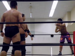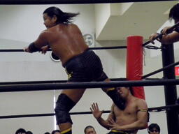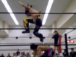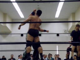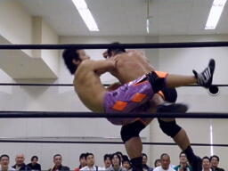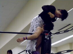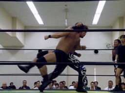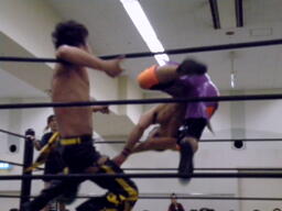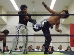 HARASHIMAサッカーボールキック(右写真)、KUDOもやり返す。HARASHIMAサッカーボールキックからギロチンドロップ3連発、カウント2。安部にタッチ。