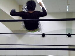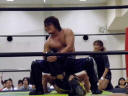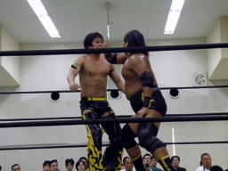 大鷲がショルダーブロックの打ち合いでコーナーに下がった際に安部は強制的にタッチ、リングに入るが高木ショルダーブロック一発で吹っ飛ばす(右写真)。高木はMIKAMIにタッチ。
