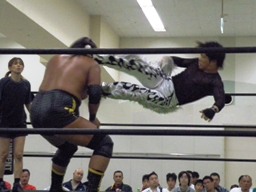 エルボー打ち合い、HARASHIMAロープに飛ぶ、KUDOバックスピンキック。タッチしようとするが大鷲が阻止。KUDO大鷲に延髄蹴り(右写真)、高木にタッチ。