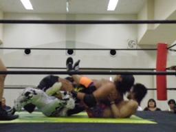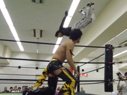 高木HARASHIMAをコーナーに上げて雪崩式ブレーンバスター(右写真)、カウント2。