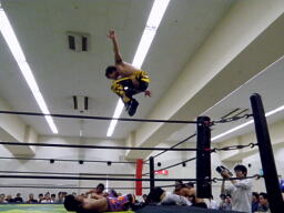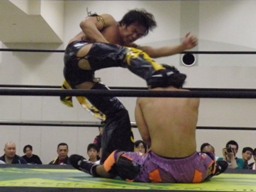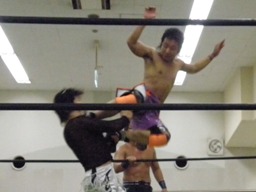 KUDO続いてダイビングダブルニードロップ(右写真)、HARASHIMAがカット。
