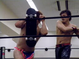 2発目ディーノブロックして逆にぶつける。旭は場外エスケープ。ディーノはスケートボードで旭の尻を突いて追い回す(左写真)。