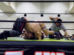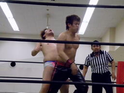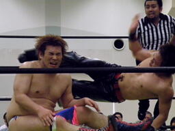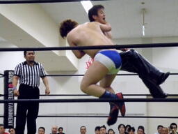 ディーノはファイト・2発目から再度男色ドライバー狙う、旭は松井レフェリーをぶつけ(左写真)、その背中を利用して阿吽。