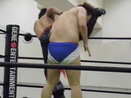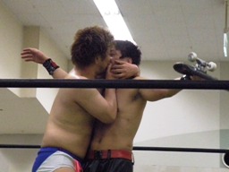 ディーノストンピング、再び男色クロー(右写真)、旭ロープ。受けまくりやん。