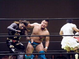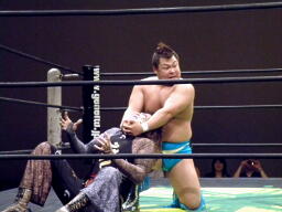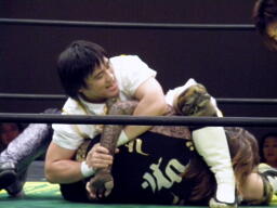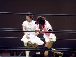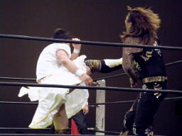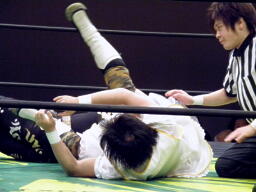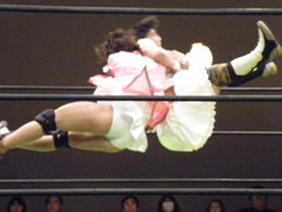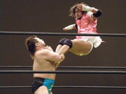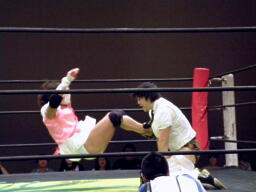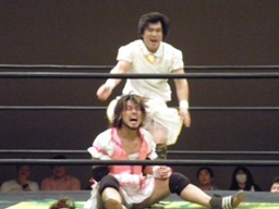 佐藤は2発目を着地すると内田の足を取ってバナナ・スプレッド(右写真)。「どうだこのプレイは!」プレイだったのか。内田十字に切り返す、佐藤がロープ。内田はポイズンにタッチ。