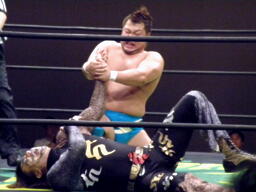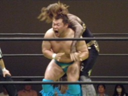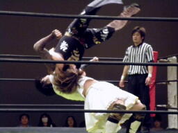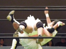 佐藤持ち上げて水車落とし(右写真)、さらに松永が投げっ放しパワーボム。これで内田は戦闘不能に。
