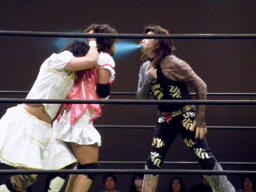 内田を呼び込んでダブルでロープに振ってクローズライン、佐藤かわして内田のバック取るとポイズンにぶつける。ポイズンブルーミスト、内田に直撃(右写真)。