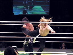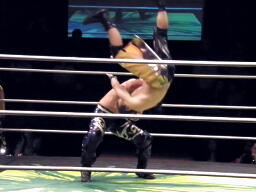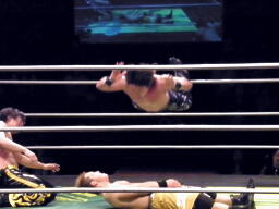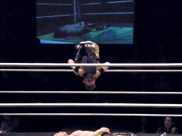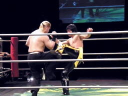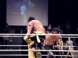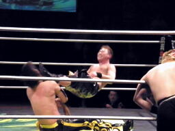 ロープワークから梶がヒップトス狙うがHARASHIMAブロックして逆にヒップトス(右写真)。KUDOを呼び込んでダブルの攻撃、梶かわして2人にドロップキック、真霜にタッチしようとするがKUDOが真霜を場外に落として阻止。