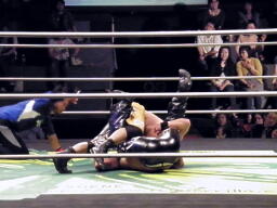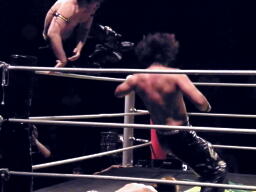 真霜ローキック(左写真)。バックの取り合い、首の取り合い、真霜が上になるがKUDOブレーク。KUDOローキック、ミドルキック、真霜キャッチ。真霜コーナーに押し込んで梶にタッチ。梶ネックロック、KUDOコーナーに押し込んでHARASHIMAにタッチ。