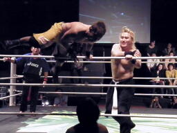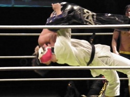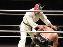 しかしそこに柔道着にHERO!マスクの大男が乱入、HARASHIMAを襲う(右写真)。